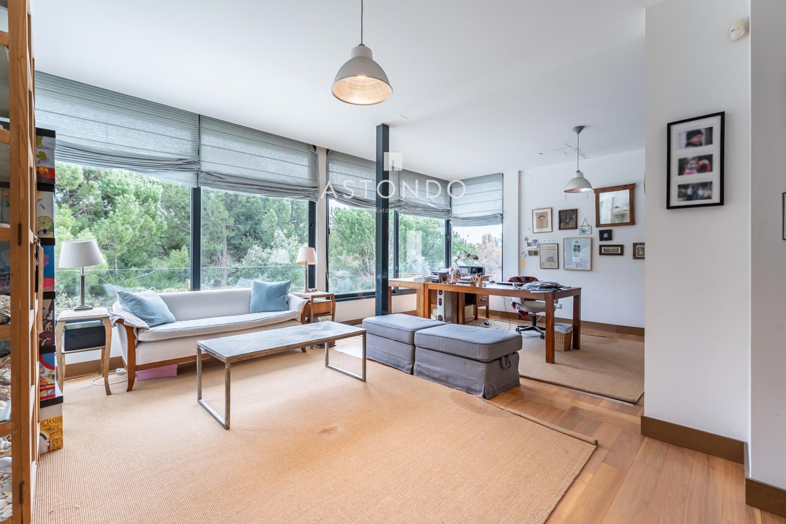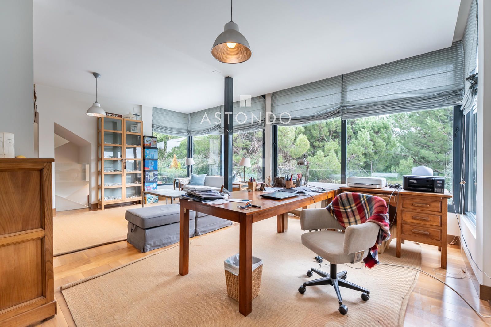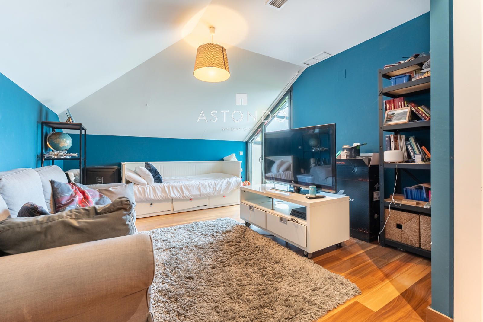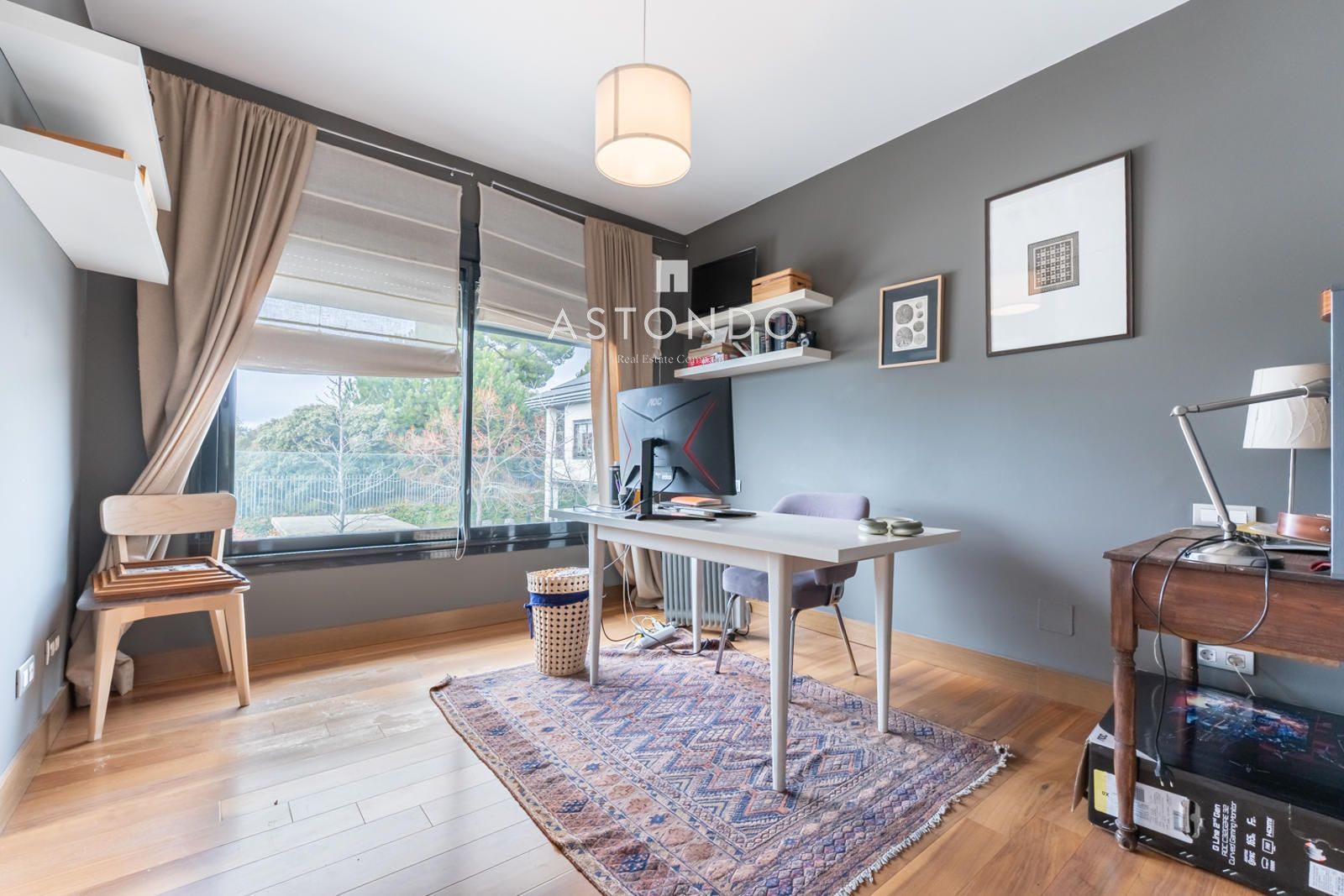 Con 740 m2 construidos, la vivienda se organiza en tres niveles que separan de forma muy funcional las distintas áreas. La planta baja está destinada a la zona de día, con un amplio salón comedor, una gran sala de estar con chimenea, la cocina independiente y dos aseos de cortesía. En la planta primera se ubica la zona de noche, formada por tres dormitorios, 2 con baño en suite, y el tercero con baño en el pasillo y un despacho con grandes ventanales que aportan una excelente luminosidad. La última planta alberga la buhardilla, con dos dormitorios adicionales, dos baños completos y una terraza que los comunica entre sí.