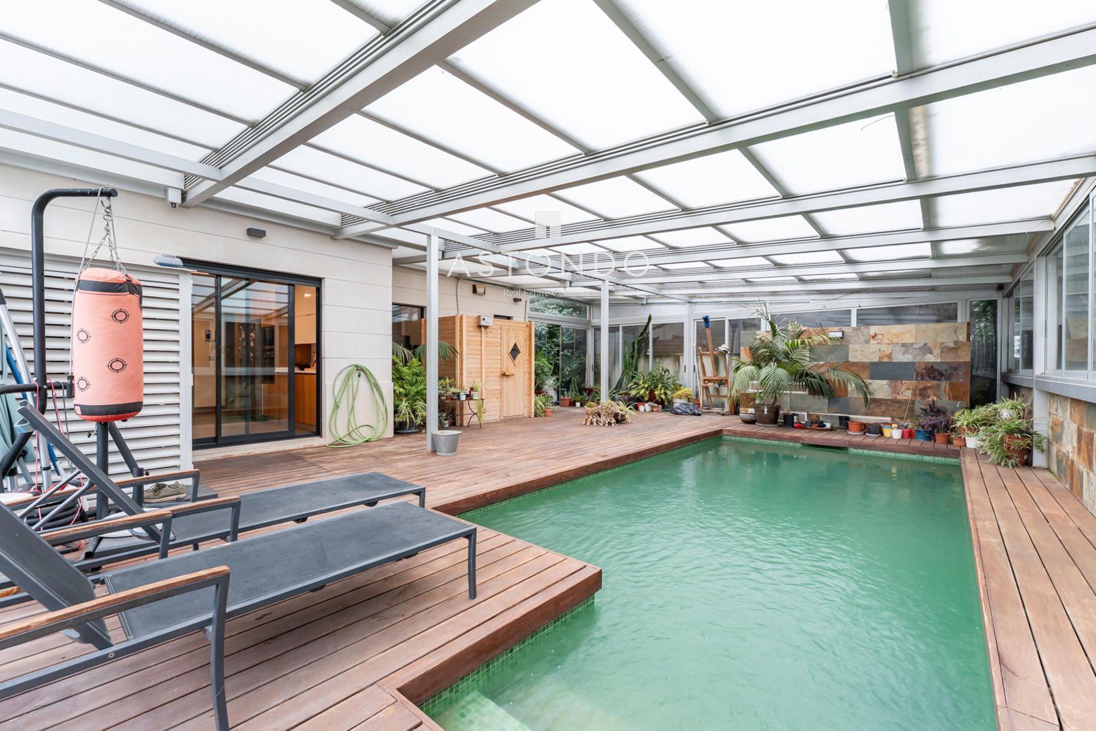 En el exterior, la propiedad disfruta de un cuidado jardín que rodea completamente la vivienda, proporcionando privacidad y vistas verdes desde todas las estancias. En la parte delantera se encuentra un gran porche con suelo de pizarra, mientras que en la parte trasera se abre una elegante terraza cubierta con cerramiento acristalado que alberga la piscina climatizada privada y una zona de sauna, creando un espacio de bienestar luminoso y protegido que puede disfrutarse durante todo el año.