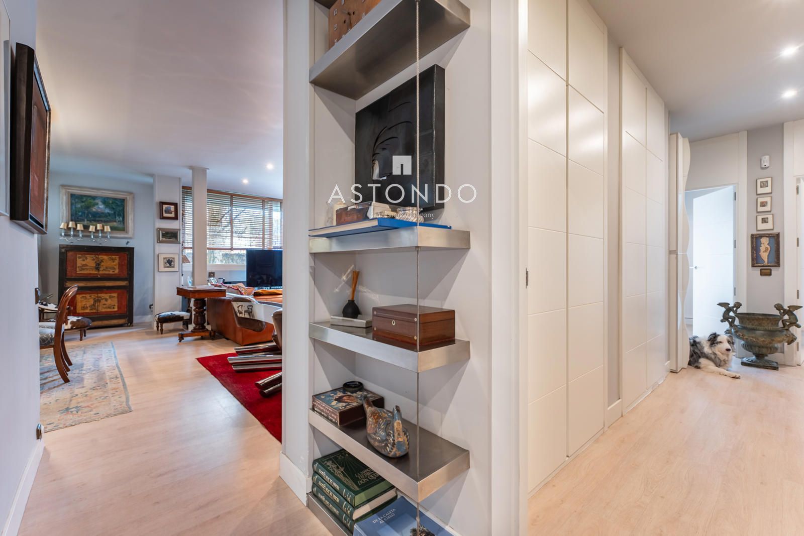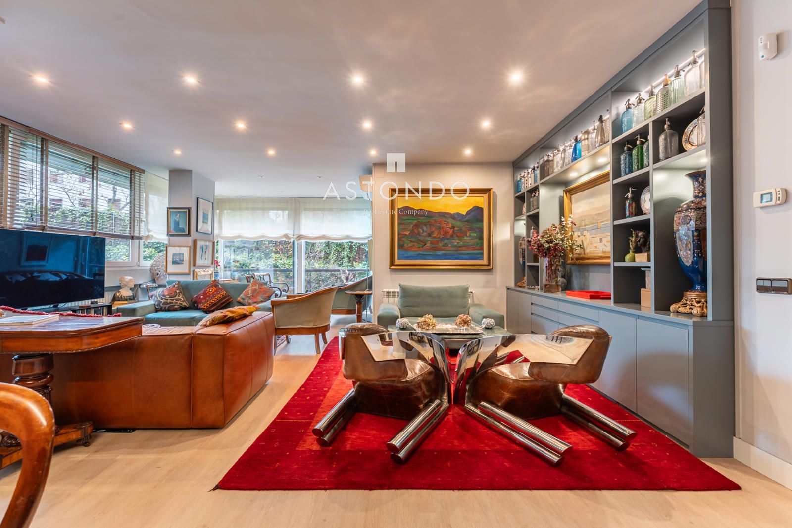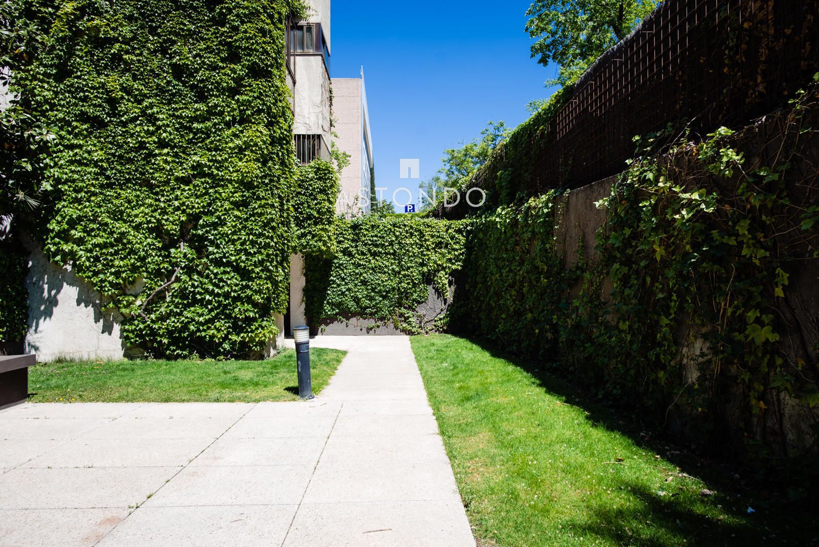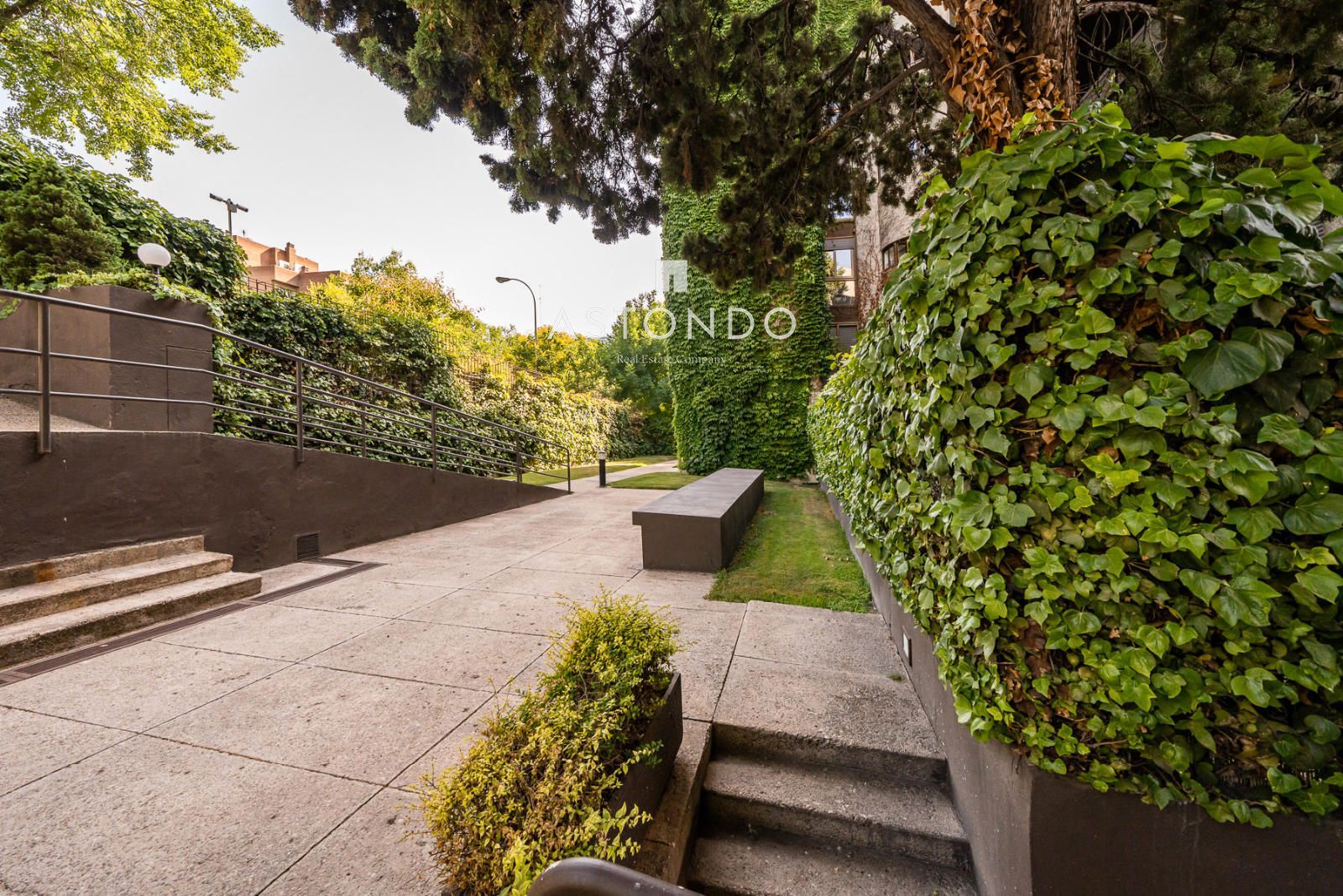 La vivienda ha sido reformada recientemente. dispone de dos entradas, la principal, a la que se accede directamente desde el ascensor, da paso a un amplio hall desde el que accedemos a la cocina, un espacio enorme, con zona de comedor e isla, también dispone de una lavandería y la habitación de servicio, que hoy en día se utiliza como despacho. A la izquierda del hall tenemos un gran salón comedor que destaca por los grandes ventanales que dan a una zona del jardín muy tranquila, casi parece un jardín particular, por lo que es muy tranquilo. La zona más privada de la casa está separada por una puerta, por la que accedemos a un pasillo, donde hay un gran armario ropero. La habitación principal cuenta con zona de vestidor y baño en suite, así como más armarios ropero, las otras dos habitaciones comparten otro baño. Todas las habitaciones tienen mucha luz natural.