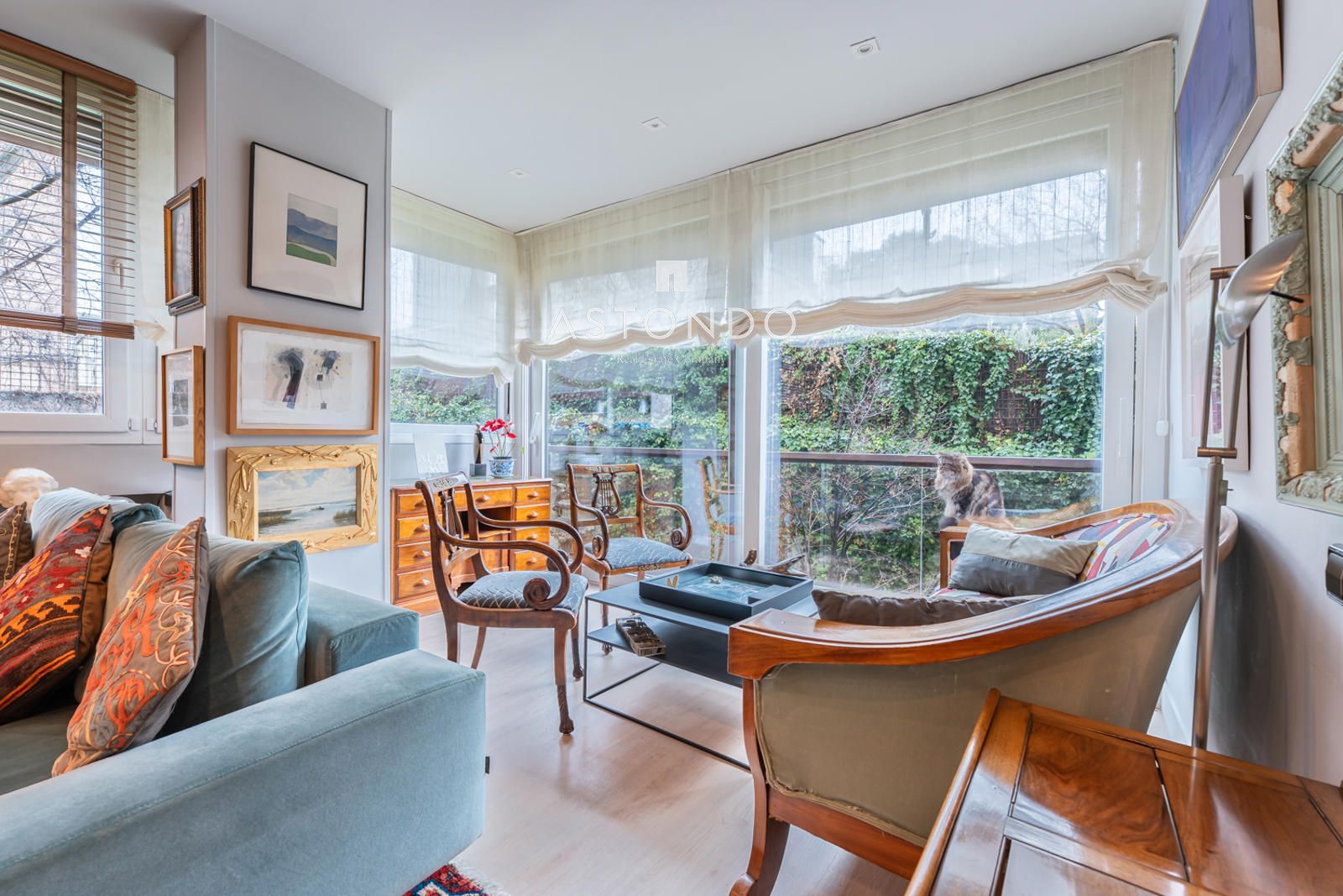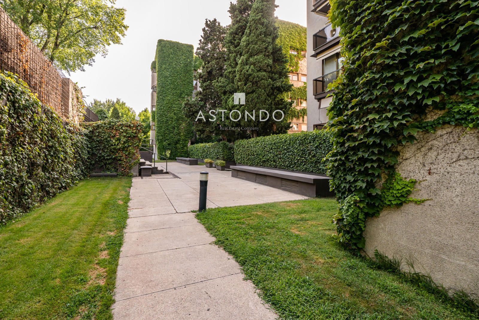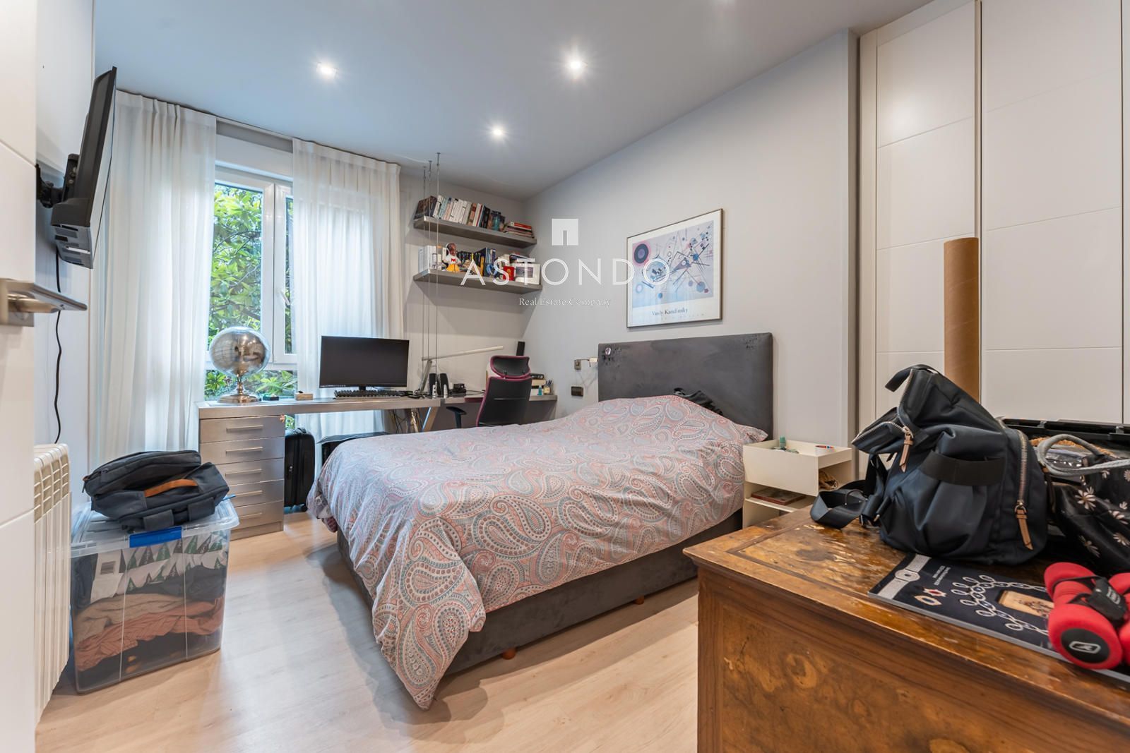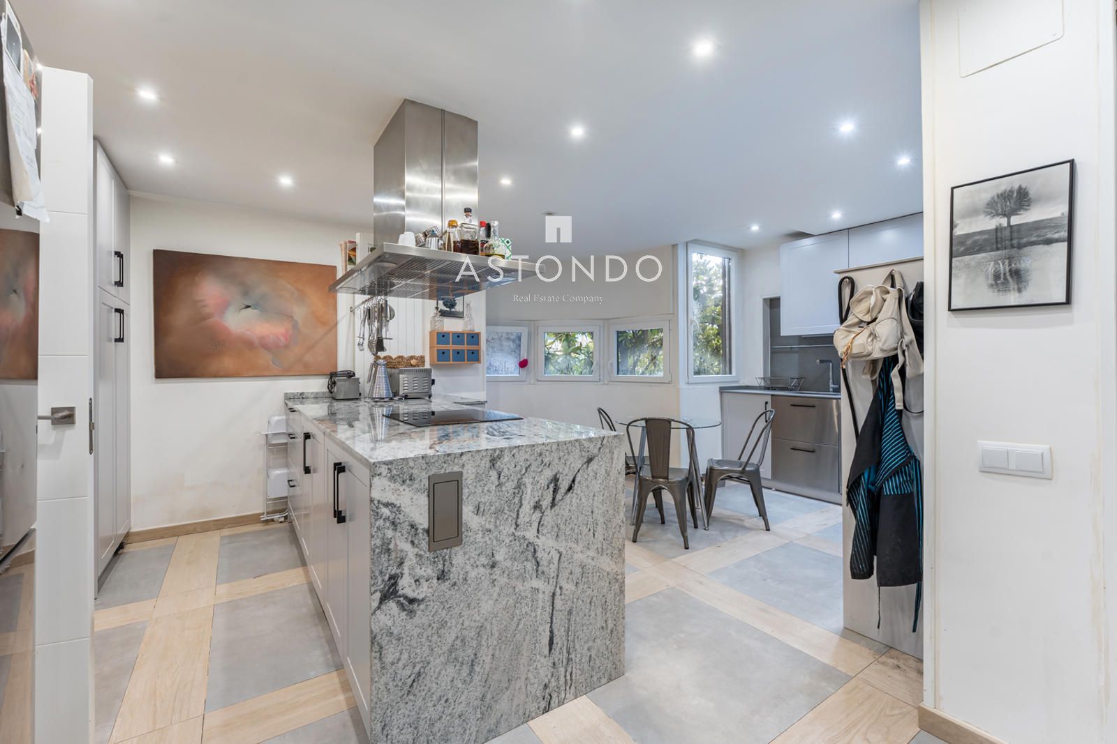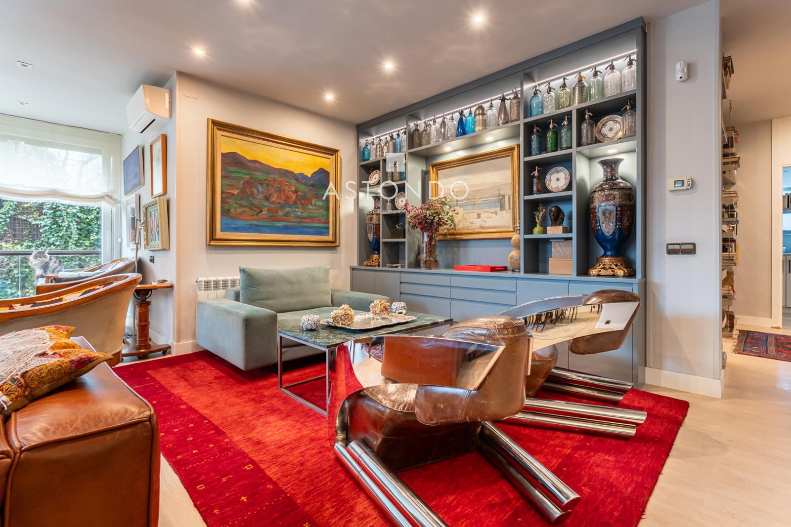 La vivienda ha sido reformada recientemente. dispone de dos entradas, la principal, a la que se accede directamente desde el ascensor, da paso a un amplio hall desde el que accedemos a la cocina, un espacio enorme, con zona de comedor e isla, también dispone de una lavandería y la habitación de servicio, que hoy en día se utiliza como despacho. A la izquierda del hall tenemos un gran salón comedor que destaca por los grandes ventanales que dan a una zona del jardín muy tranquila, casi parece un jardín particular, por lo que es muy tranquilo. La zona más privada de la casa está separada por una puerta, por la que accedemos a un pasillo, donde hay un gran armario ropero. La habitación principal cuenta con zona de vestidor y baño en suite, así como más armarios ropero, las otras dos habitaciones comparten otro baño. Todas las habitaciones tienen mucha luz natural.