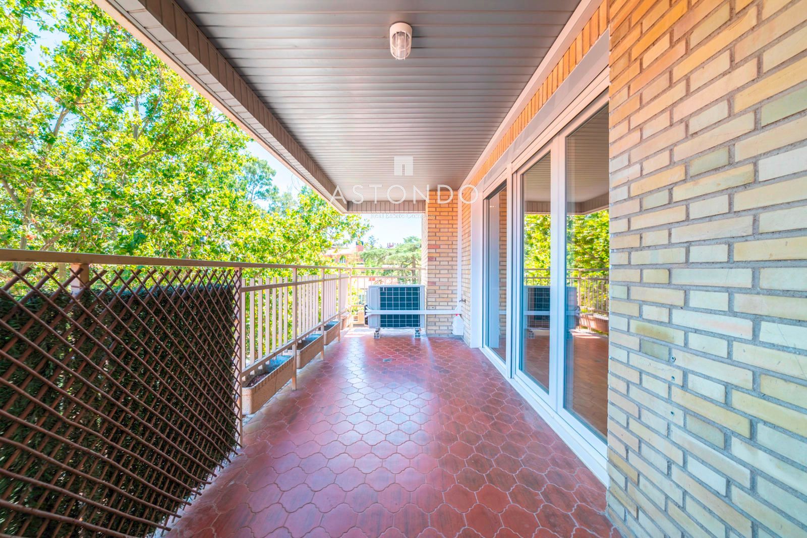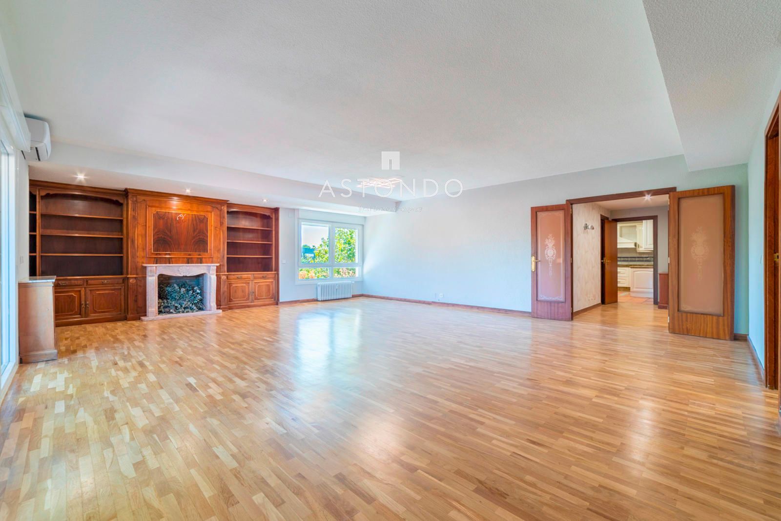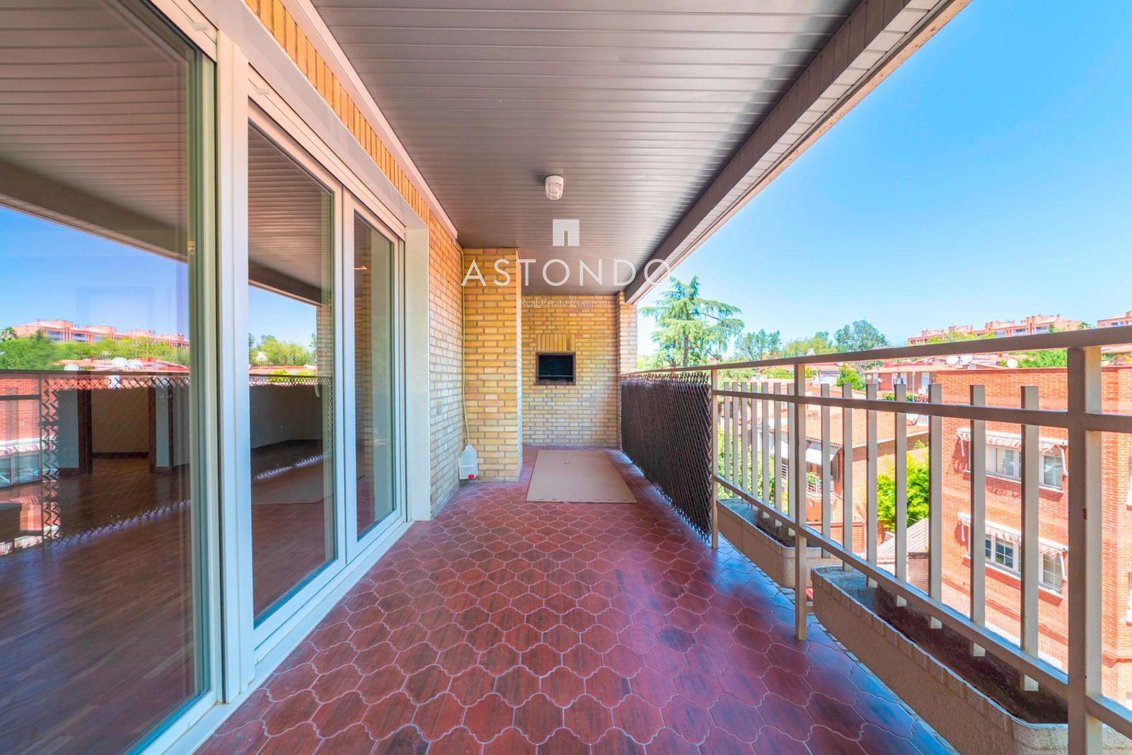 En Arturo Soria en la zona de El Bosque se alquila un bonito piso de más de 290 metros cuadrados, con espacios muy amplios y muy luminoso, ya que es un piso alto, con vistas despejadas y grandes ventanales. La vivienda consta de dos entradas, la principal, da acceso a un gran hall distribuidor con armario gabanero, desde el que se puede acceder a un amplísimo salón, con chimenea, que es un gran rectángulo que nos permite hacer la distribución que se quiera, desde este accedemos a una gran terraza de 25 m2, en la que se puede habilitar zona de estar como de comedor que cuenta con una pequeña barbacoa.