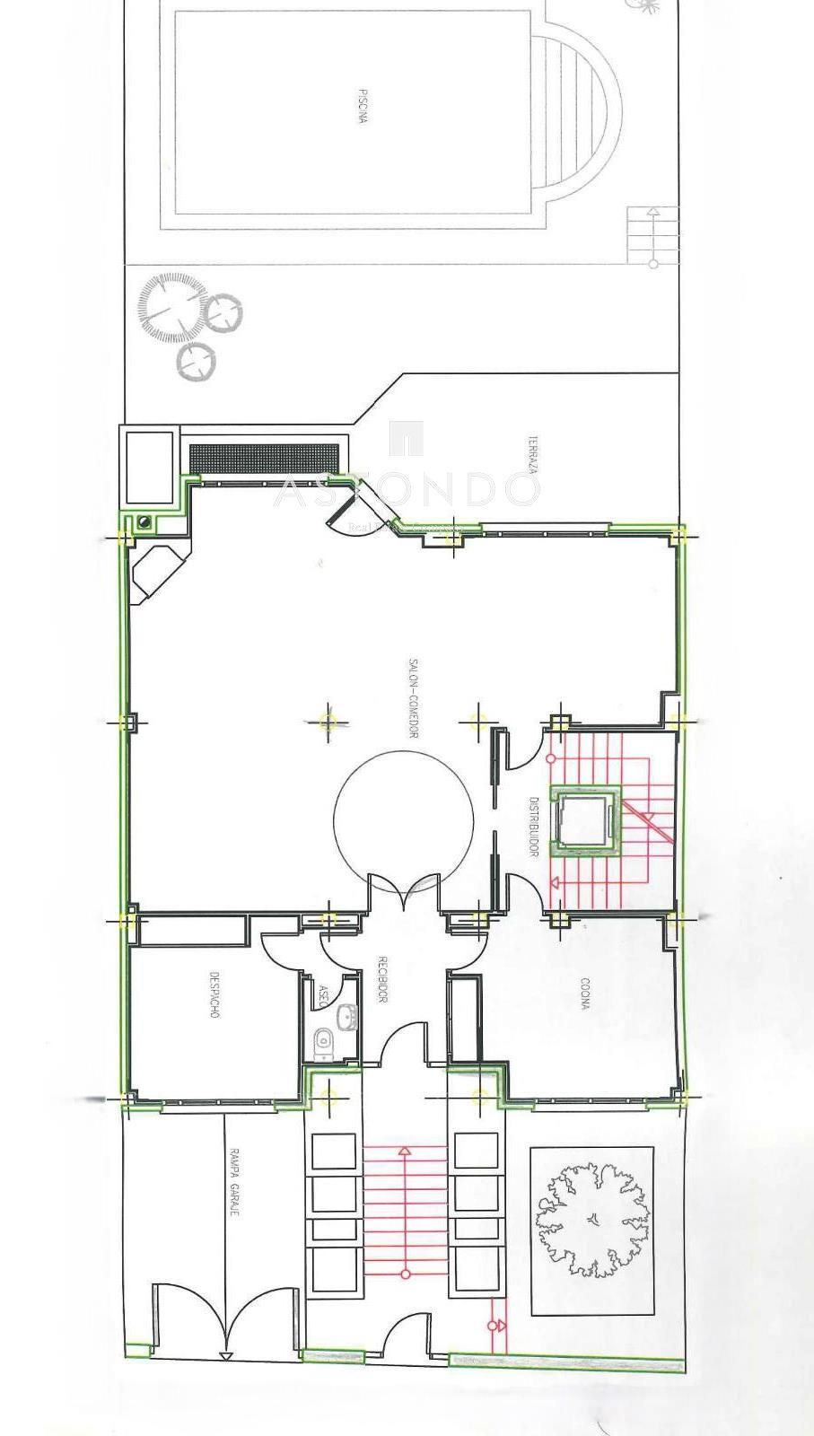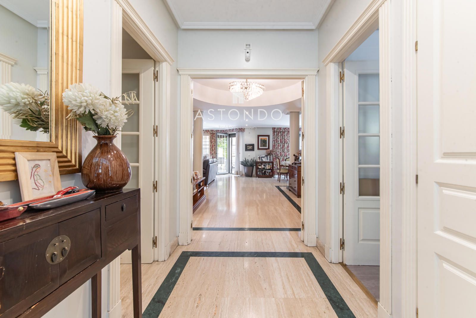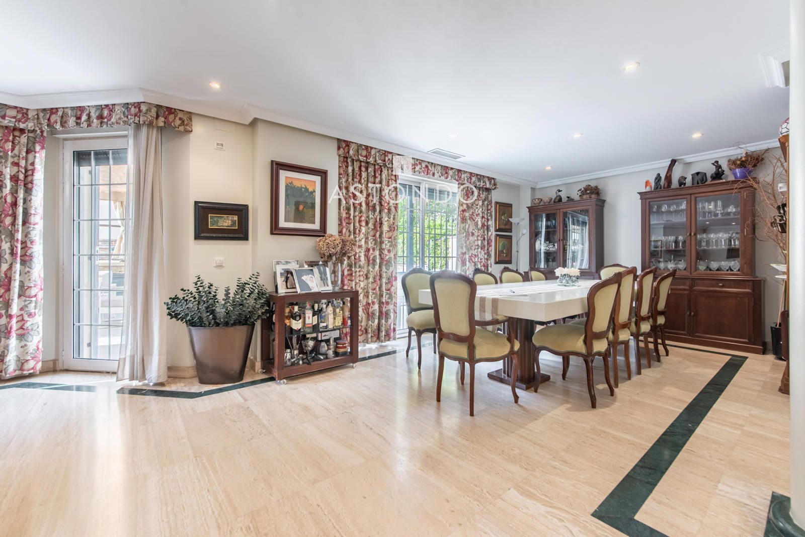 Planta baja, zona social de la casa formada por: hall de entrada, gran cocina con office comunicada con el hall de entrada y con la zona de comedor del salón, aseo de cortesía, despacho, ascensor y escalera que comunican todas las plantas de la vivienda, amplio y luminoso salón comedor de 75m2 con salida al porche trasero que nos hace de espacio intermedio entre el interior y el amplio patio que se encuentra dividido en tres sectores: sector salón exterior, sector comedor al aire libre y sector piscina y solárium.