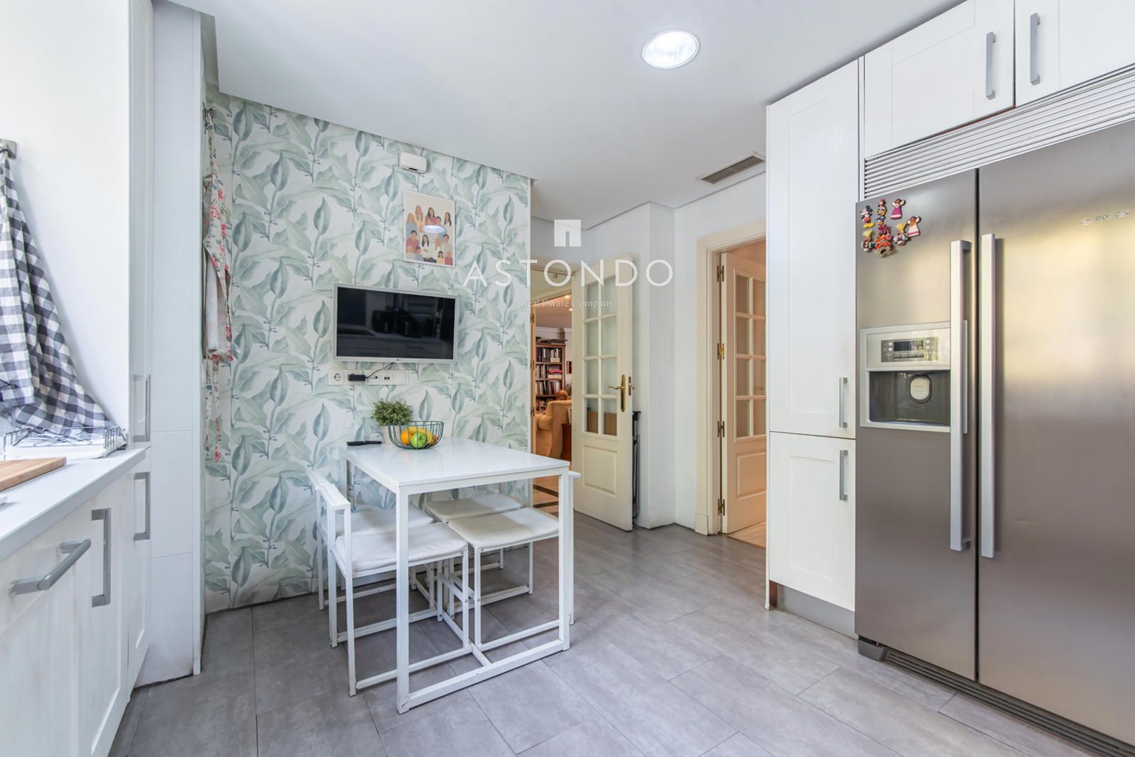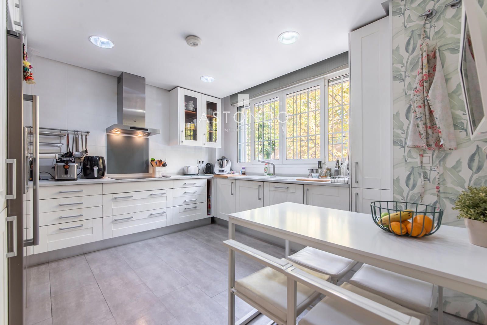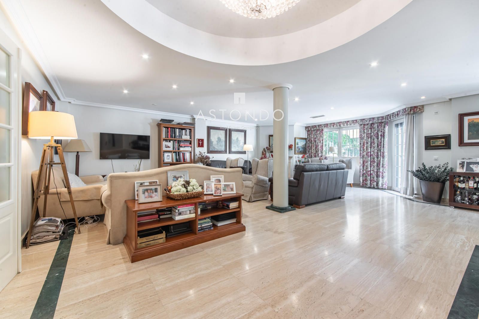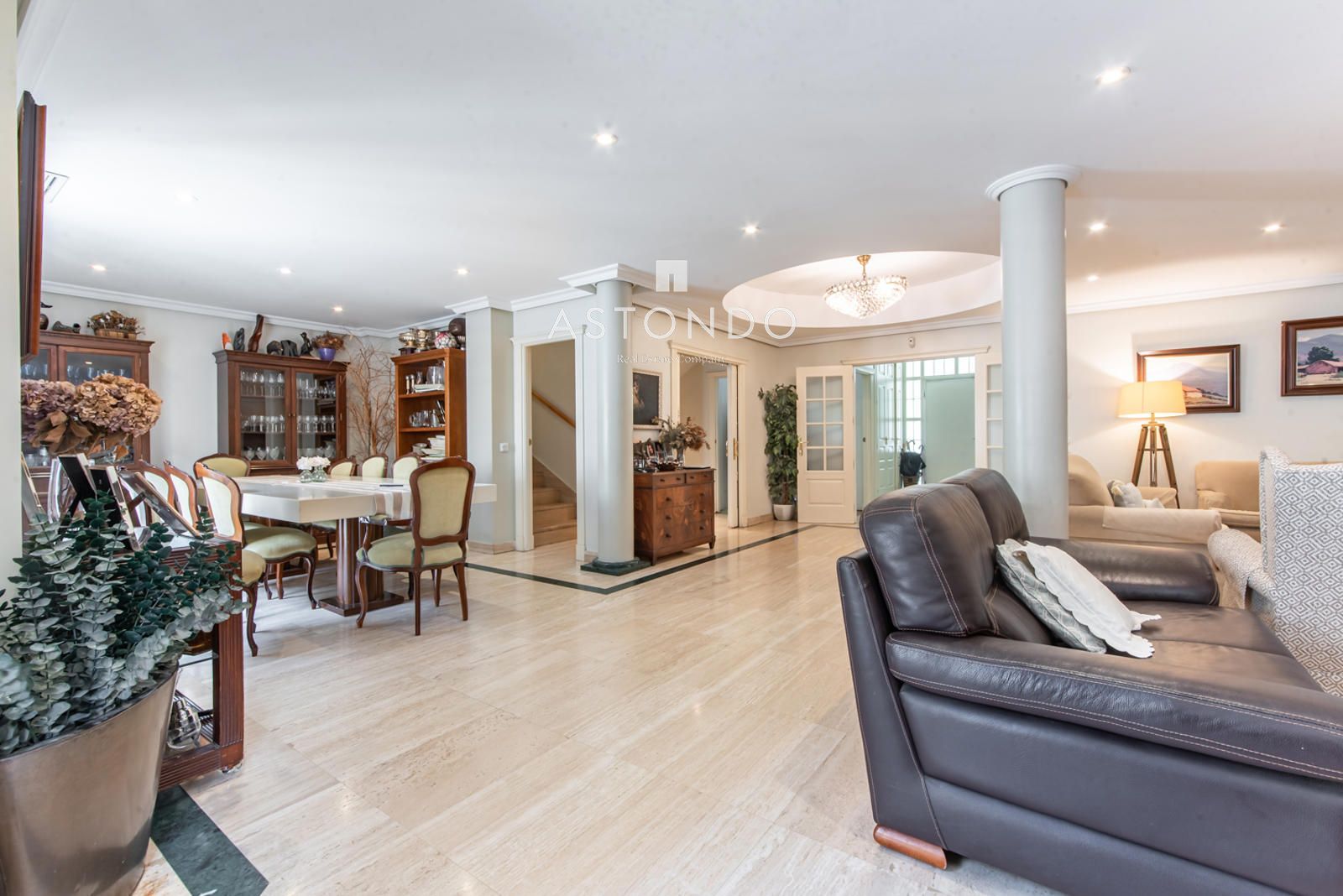 Planta baja, zona social de la casa formada por: hall de entrada, gran cocina con office comunicada con el hall de entrada y con la zona de comedor del salón, aseo de cortesía, despacho, ascensor y escalera que comunican todas las plantas de la vivienda, amplio y luminoso salón comedor de 75m2 con salida al porche trasero que nos hace de espacio intermedio entre el interior y el amplio patio que se encuentra dividido en tres sectores: sector salón exterior, sector comedor al aire libre y sector piscina y solárium.