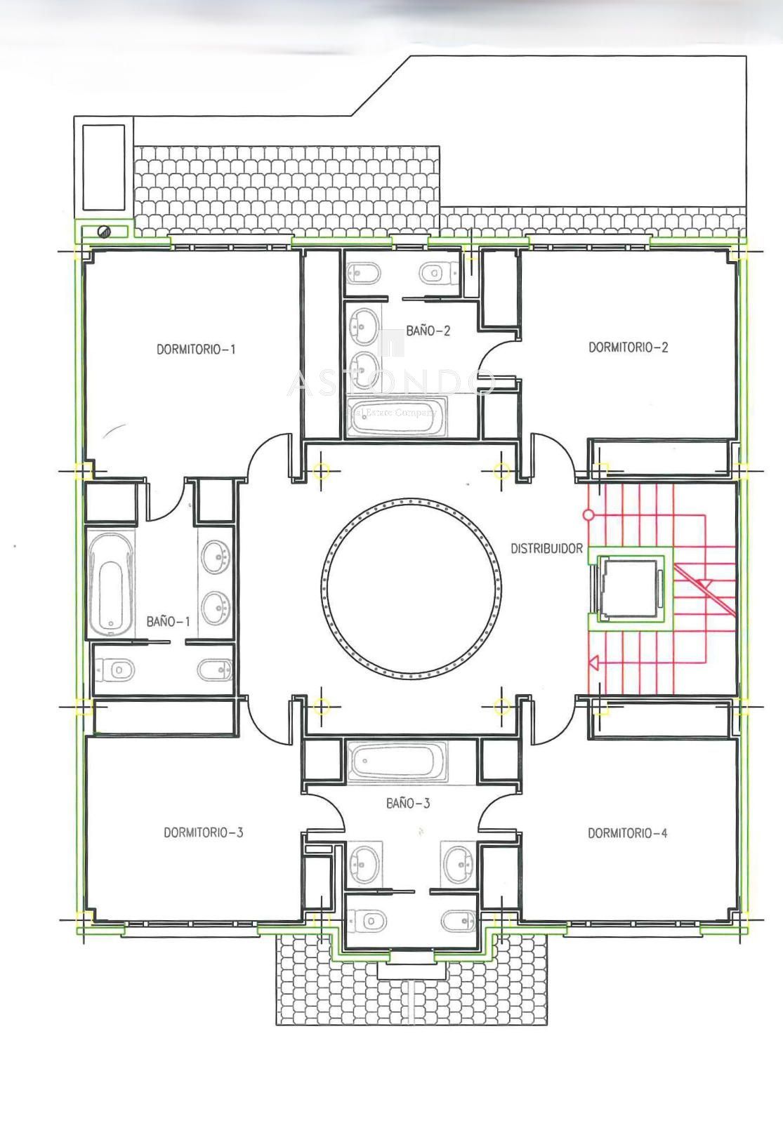 En la primera planta encontramos un gran salón de estar intimo que hace las veces de distribuidor, cuatro amplios dormitorios y tres baños. Dos dormitorios comparten y se comunican por un baño y los otros dos dormitorios tienen baño en suite.