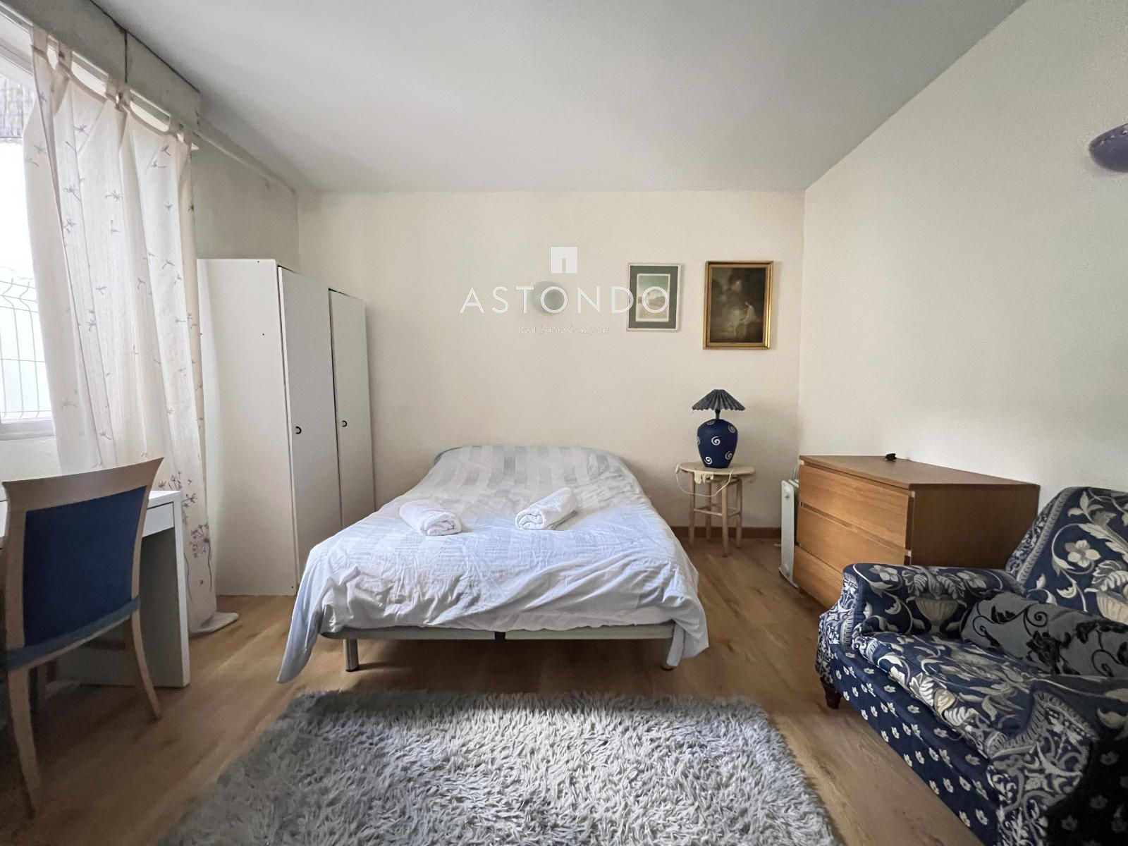 Appartement meublé à louer, 122 m², comprenant 5 chambres spacieuses avec lits doubles ou simples, armoires et bureaux ; une cuisine avec coin repas et une buanderie équipée d'électroménager, d'ustensiles de cuisine et d'un lave-linge.